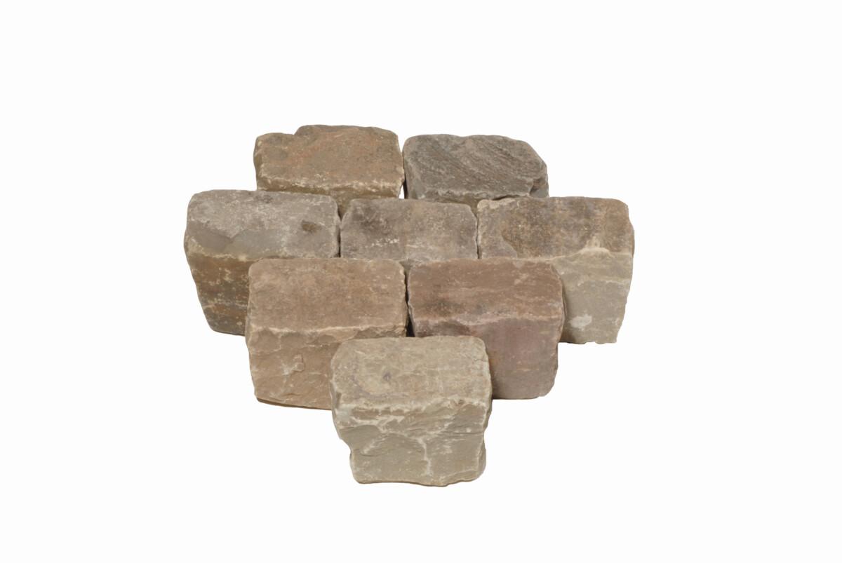 Les pavés de grès se déclinent selon une gamme extrêmement variée, avec des teintes plus vives (jaune, vert, rouge, brun rouillé) ou plus sourdes (du gris vert au gris bleu, lie-de-vin, ocre, beige). La pierre se patine respectivement en brun rouille lorsqu’elle est riche en fer, et dans les tons gris bleu ou verdâtres.